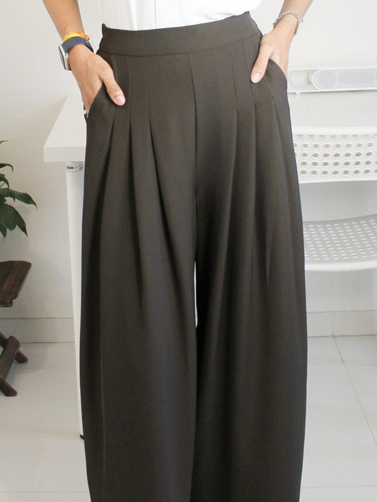 Wide-Leg Brown Pleated Tailored Korean Trouser